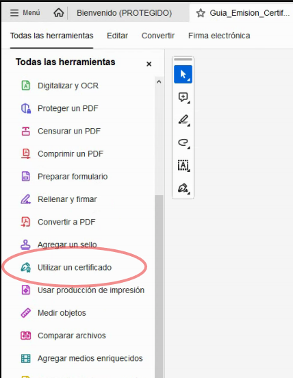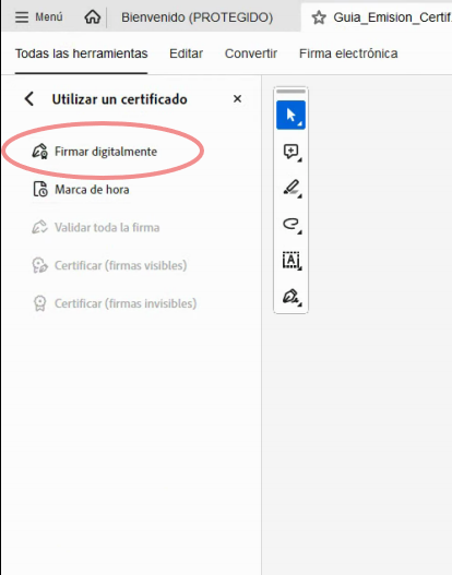 1. Seleccione Todas las herramientas > Usar un certificado > Firmar digitalmente.