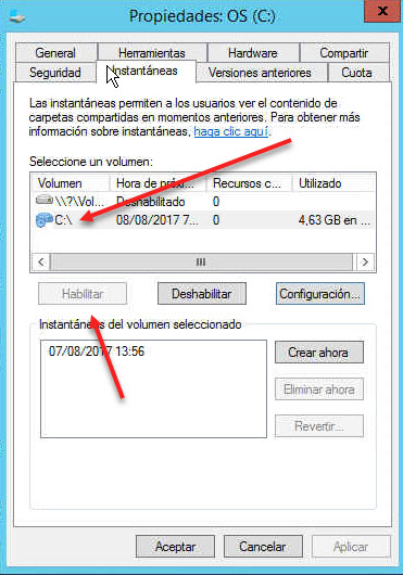 Procederemos a abrir las propiedades del disco C y habilitar las instantáneas de volumen en dicho disco para evitar pérdidas de datos del servidor y que la recuperación del mismo sea más sencilla si deja de funcionar: